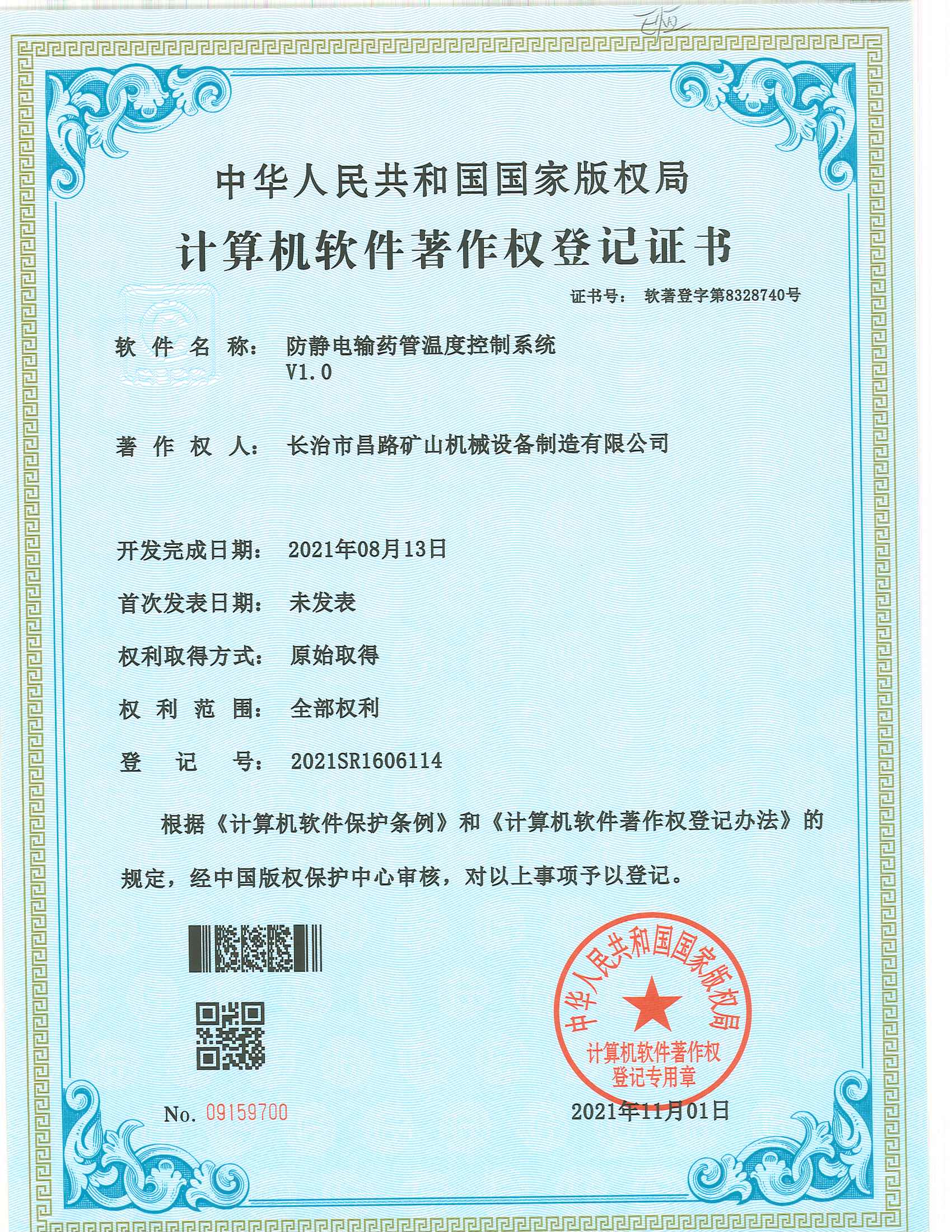 防靜電輸藥管溫度控制系統(tǒng)著作權(quán)登記證書
